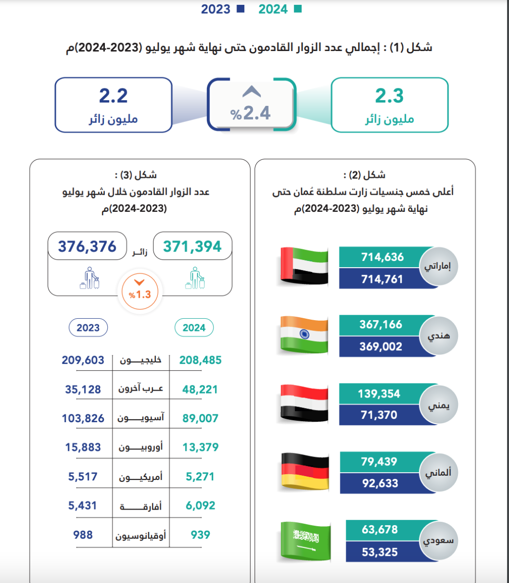 الوصال - أشارت آخر الاحصائيات في تقرير المؤشرات السياحية الصادرة من المركز الوطني للإحصاء والمعلومات أن إجمالي عدد الزوار القادمون إلى سلطنة عمان نهاية شهر يوليو من العام الجاري 2.3 مليون زائرًا مرتفعًا بنسبة 2.4% عن العام الماضي