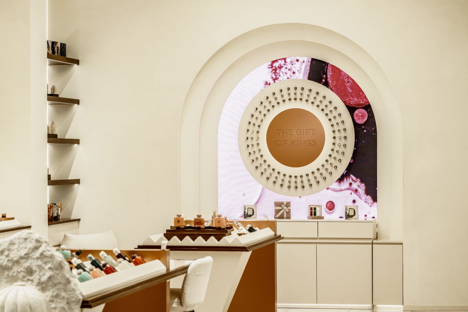 وتحاكي التكوينات المنحوتة حركة الكثبان الرملية بانحناءاتها المتدرجة، بينما تتوزّع الطاولات المصنوعة من الترافرتين بلون الرمال في مشهد يستحضر جمال الطبيعة في عُمان. وتظهر زجاجات أمواج كمنحوتات من الحجر الرملي، بخطوط مستلهمة من المعمار العُماني العريق. وفي قلب هذه المساحات الإبداعية، تتربّع ’هدية الملوك‘، كرمز للفخامة والتميّز.