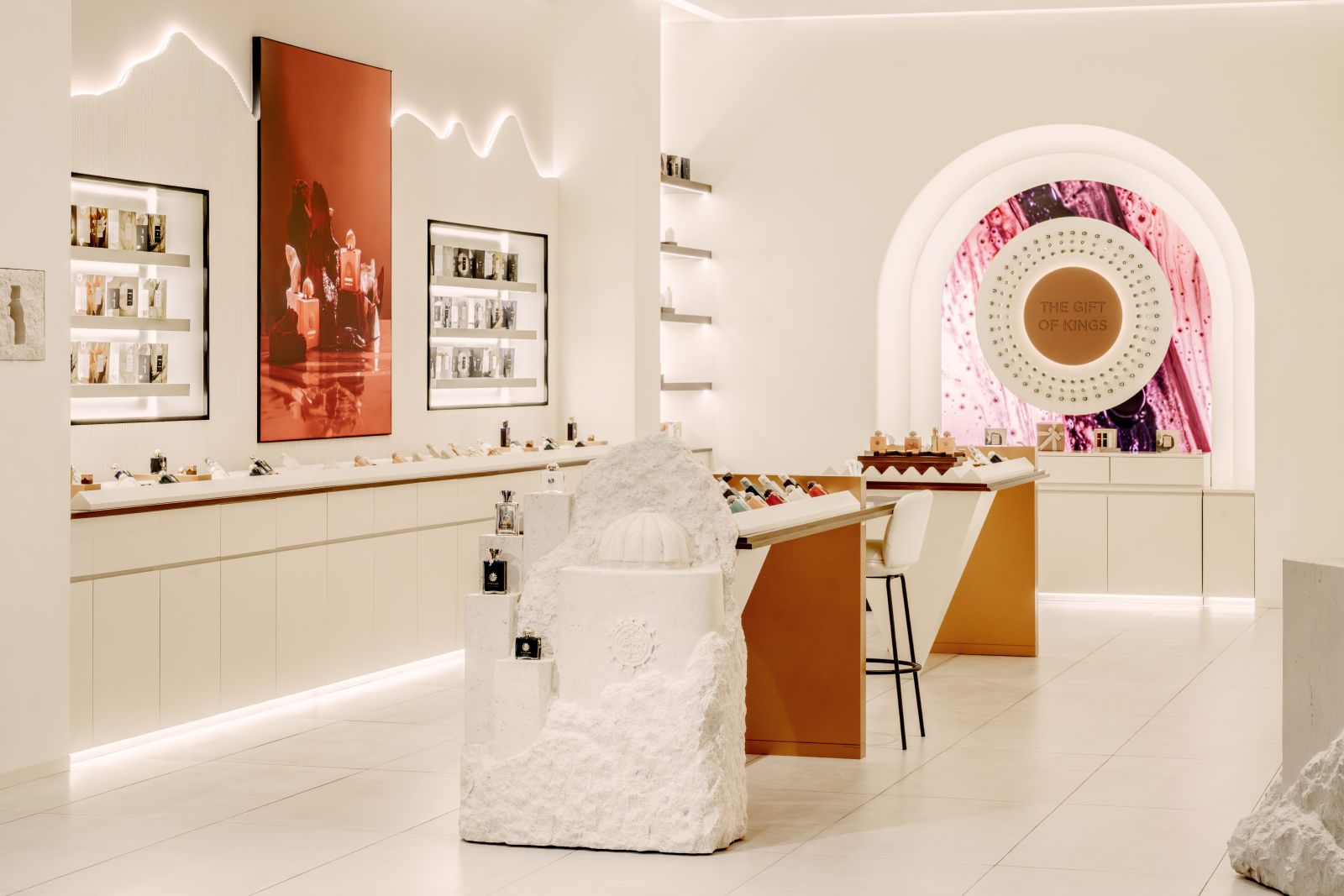 صُمم البوتيك ليعكس فلسفة الدار ويُقدّم تجربة متكاملة، تتناغم فيها العناصر المعمارية مع إبداعات أمواج العطرية، حيث تنفتح واجهته على مساحة داخلية هادئة من الخامات الطبيعية التي تبرز ملامحها مع تغيّر الوقت والضوء لتُضفي على المكان بعدًا يأسر الحواس.