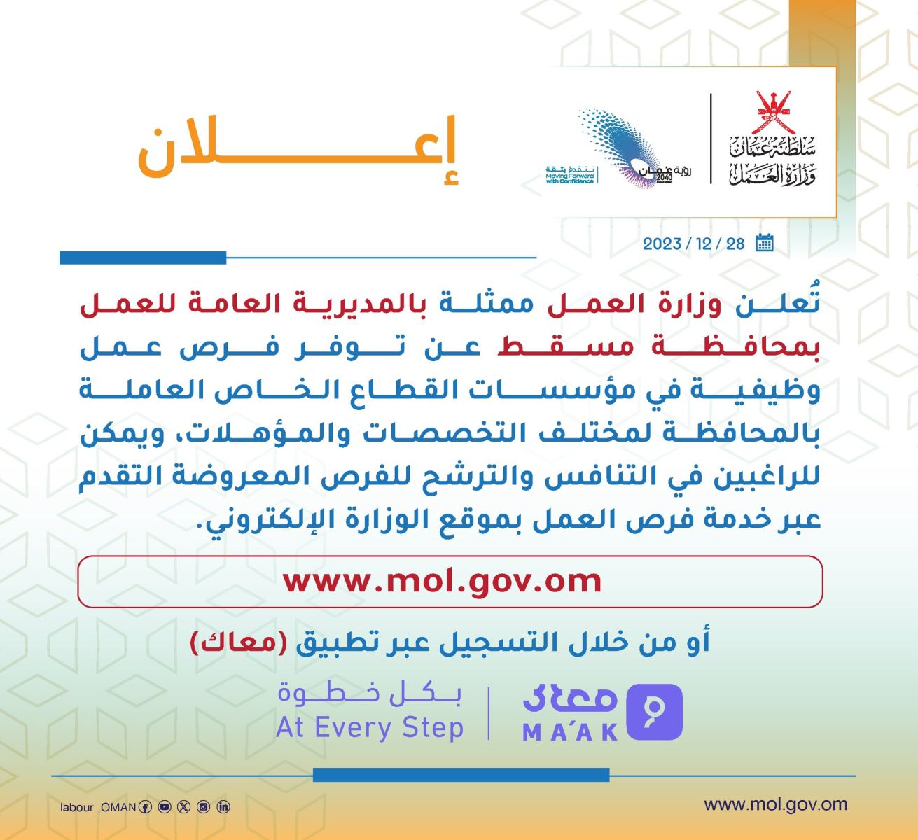الوصال – أعلنت وزارة العمل ممثلة بالمديرية العامة للعمل بمحافظة مسقط عن توفر فرص وظيفية بمؤسسات القطاع الخاص بمختلف التخصصات والمؤهلات .