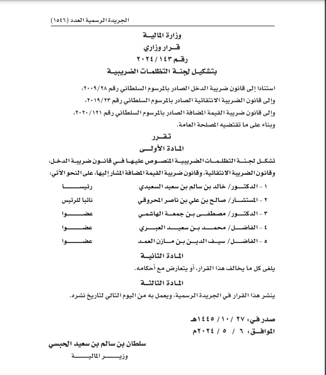 الوصال – أصدر معالي سلطان الحبسي وزير المالية قرارًا وزاريًا بتشكيل لجـــنــــــة التظلـــمــــــات الضريبيـــــة المنصـــــوص عليــهــــا فــــــي قانــــــون ضريبـــة الدخـــل، وقانـون الضريبة الانتقائية، وقانون ضريبة القيمة المضافة بحسب ما صدر اليوم في الجريدة الرسمية على النحو الآتي: