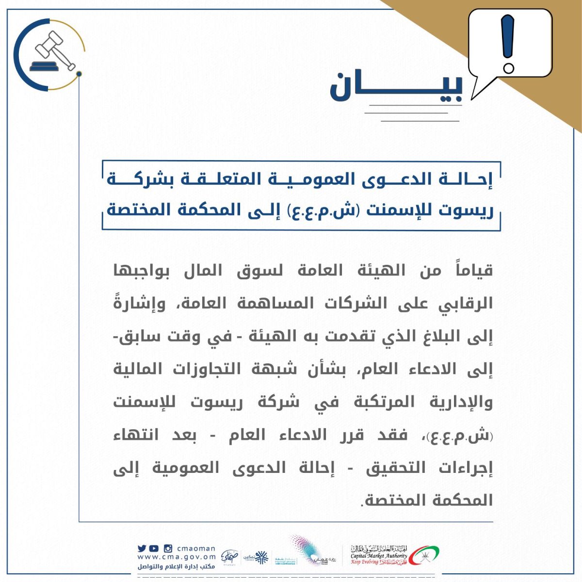 الوصال – قرر الادعاء العام بعد انتهاء إجراءات التحقيق من شبهة التجاوزات المالية والإدارية المرتكبة في شركة ريسوت للإسمنت التي تقدمت بها الهيئة العام لسوق المال إحالة الدعوى العمومية إلى المحكمة المختصة، ذلك بحسب ما أشارت إليه الهيئة العامة لسوق المال في بيان لها عبر "تويتر"