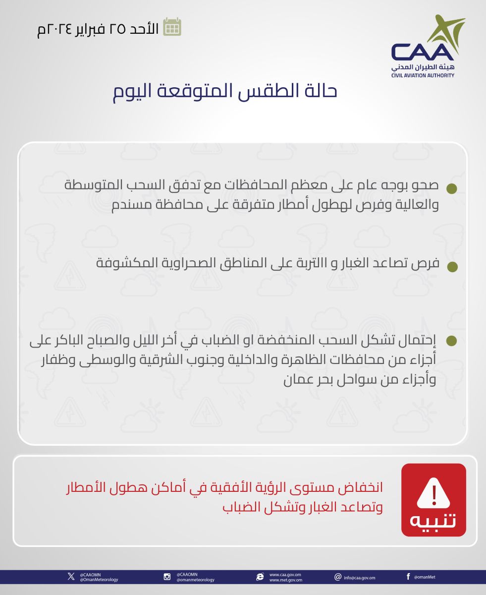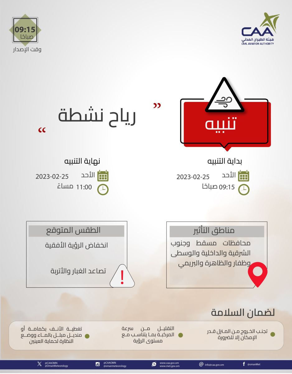 كما نبهت من استمرار نشاط الرياح وتأثر كل من محافظة مسقط، ومحافظة جنوب الشرقية، ومحافظة الداخلية، ومحافظة الوسطى، ومحافظة ظفار ، ومحافظ البريمي، ومحافظة الظاهرة. وأشارت إلى تجنب الخروج من المنازل إلا في الضرورة، وتقليل من سرعة المركبة بما يتناسب مع مستوى الرؤية.