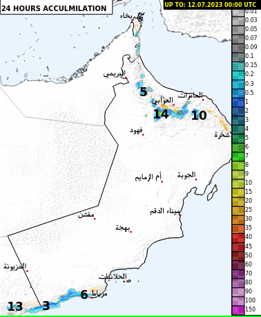 مرفق بـ كميات الأمطار التراكمية المتوقعة اليوم النموذج العددي العماني (للإستدلال)