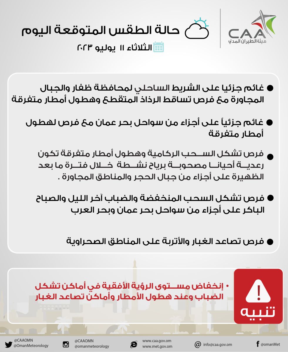 الوصال - نبهت الأرصاد العمانية عبر حسابها في تويتر عن فرص نشاط التكونات المحلية وهطول أمطار رعدية مصحوبة برياح هابطة نشطة خلال فترة الظهيرة والمساء على المناطق جبال الحجر والمناطق المجاورة لها.