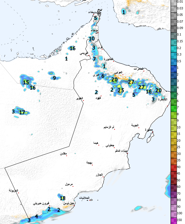 وأشارت الأرصاد إلى كميات الأمطار التراكمية المتوقعة اليوم بالاستدلال بنموذج العددي العماني .