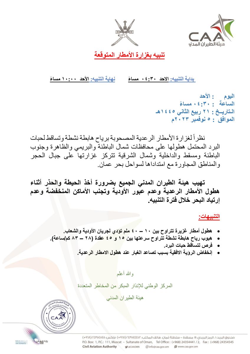 الوصال - نبهت الأرصاد العمانية بهطول أمطار رعدية مصحوبة برياح هابطة نشطة وتساقط لحبات البرد المحتمل هطولها على محافظات شمال الباطنة والبريمي والظاهرة وجنوب الباطنة ومسقط والداخلية وشمال الشرقية تتركز غزارتها على جبال الحجر والمناطق المجاورة مع امتداداها لسواحل بحر عمان.