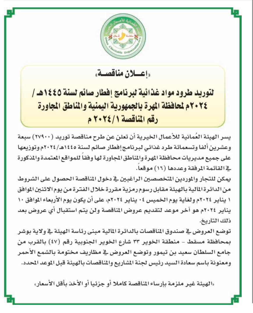 الهيئة العمانية للأعمال الخيرية تطرح مناقصة لتوريد مواد غذائية لبرنامج إفطار صائم لمحافظة المهرة اليمنية والمناطق المجاورة