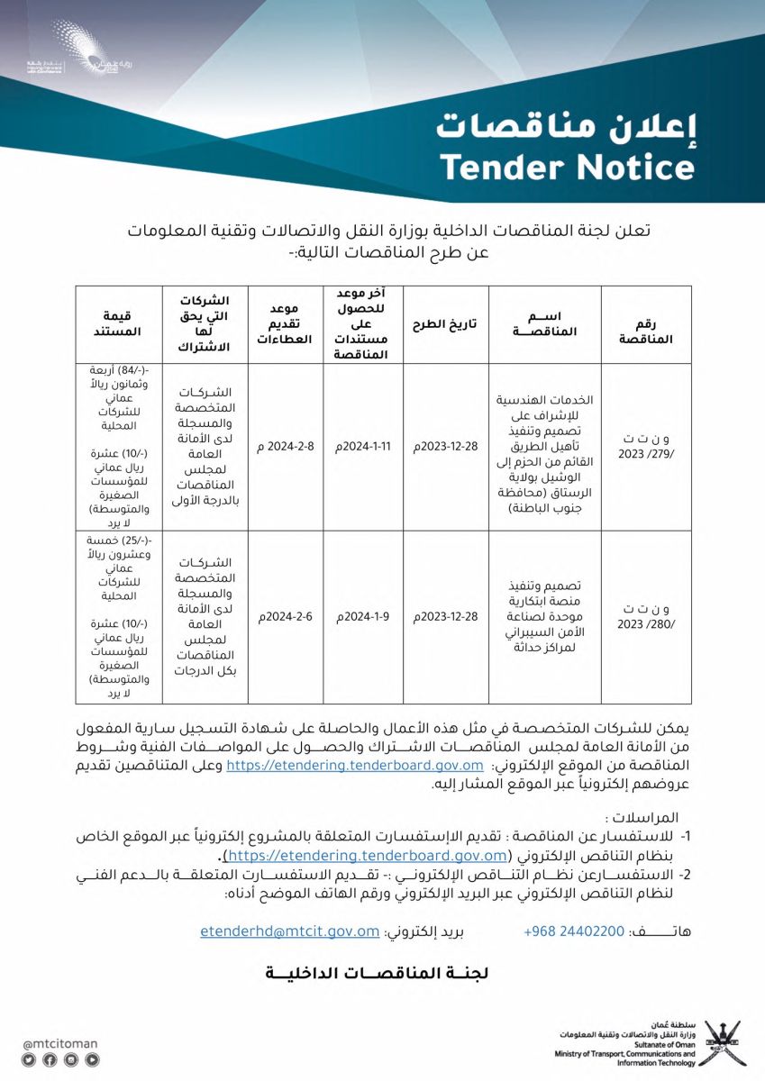 الوصال – أعلنت وزارة النقل والاتصالات وتقنية المعلومات عن طرح مناقصة الخدمات الهندسية للإشراف على تصميم وتنفيذ طريق القائم من الحزم إلى الوشيل بولاية الرستاق .