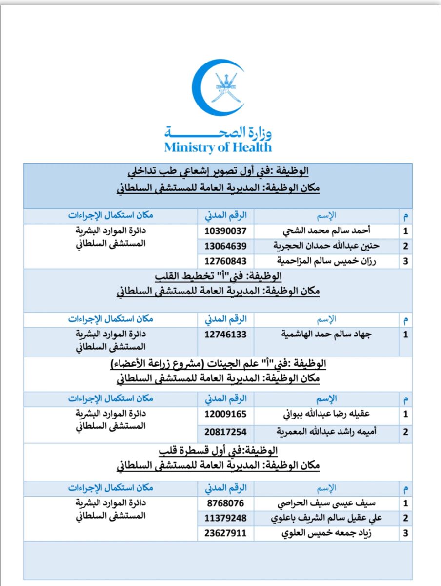 الوصال – أعلنت وزارة الصحة وبالتعاون عن مع وزارة العمل عن 14 اسم من تقدموا في 7 وظائف لإنهاء اجراءات تعيينهم.