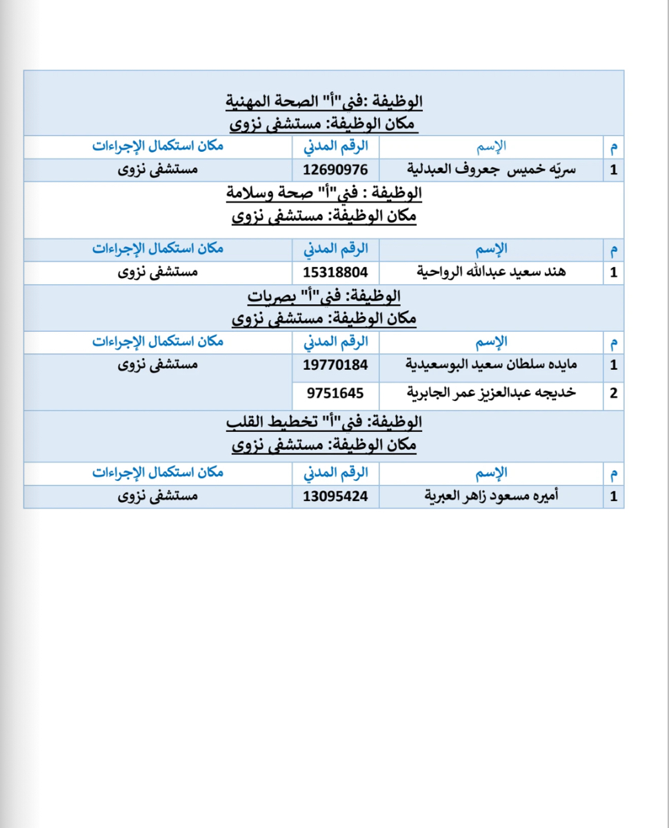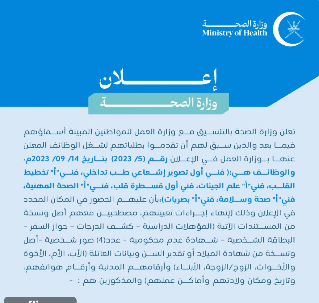 وأشارت الوزارة عبر حسابه على "تويتر" عن هذه الوظائف وهي: فني أول تصوير إشعاعي طب تداخلي، فني "أ" تخطيط القلب، فني "أ" علم الجينات، فني أول قسطرة قلب، فني "أ" الصحة المهنية، فني "أ" صحة وسلامة، فني "أ" بصريات.