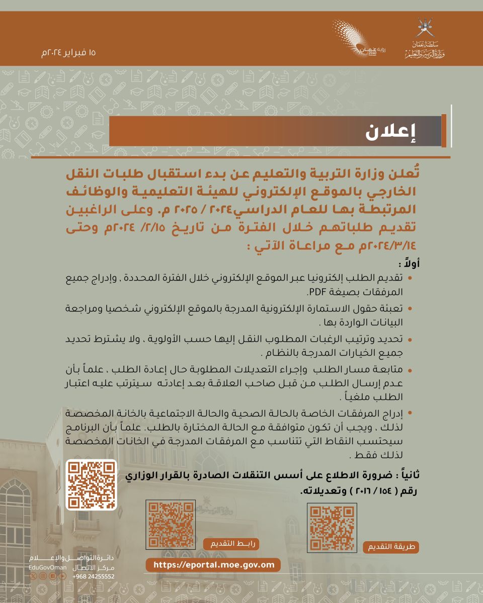 الوصال - أعلنت وزارة التربية والتعليم عن بدء استقبال طلبات النقل الخارجي بالموقع الإلكتروني للهيئة التعليمية والوظائف المرتبطة بها للعام الدراسي ٢٠٢٤ / ٢٠٢٥م.