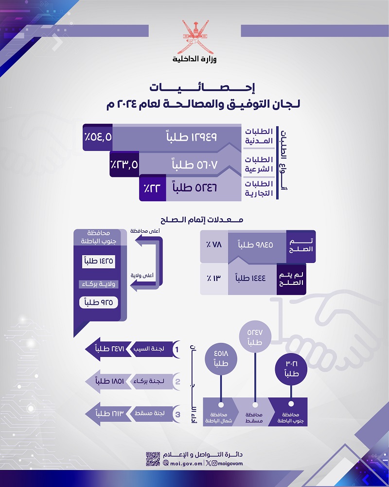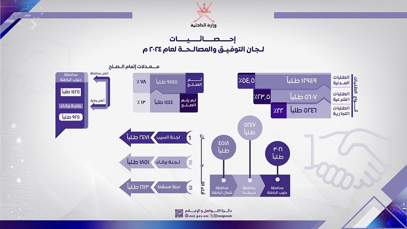 الوصال - نجحت لجان التوفيق والمصالحة نجحت في تسوية ما يقارب 10 آلاف حالة نزاع بين الافراد والمؤسسات بنسبة 87% من إجمالي الطلبات خلال عام 2024م حسب بيان دائرة شؤون لجان التوفيق والمصالحة بوزارة الداخلية.