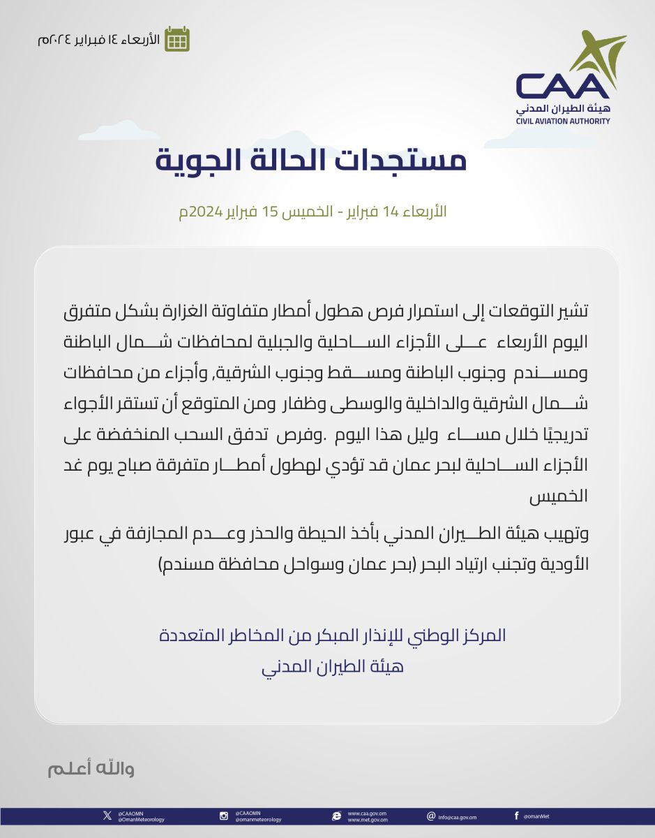 الوصال - ذكرت الأرصاد العمانية عبر حسابها على "تويتر" أن التوقعات تشير التوقعات إلى استمرار فرص هطول أمطار متفاوتة الغزارة بشكل متفرق اليوم الأربعاء على الأجزاء الساحلية والجبلية لمحافظات شمال الباطنة ومسندم وجنوب الباطنة ومسقط وجنوب الشرقية وأجزاء من محافظات شمال الشرقية والداخلية والوسطى وظفار .