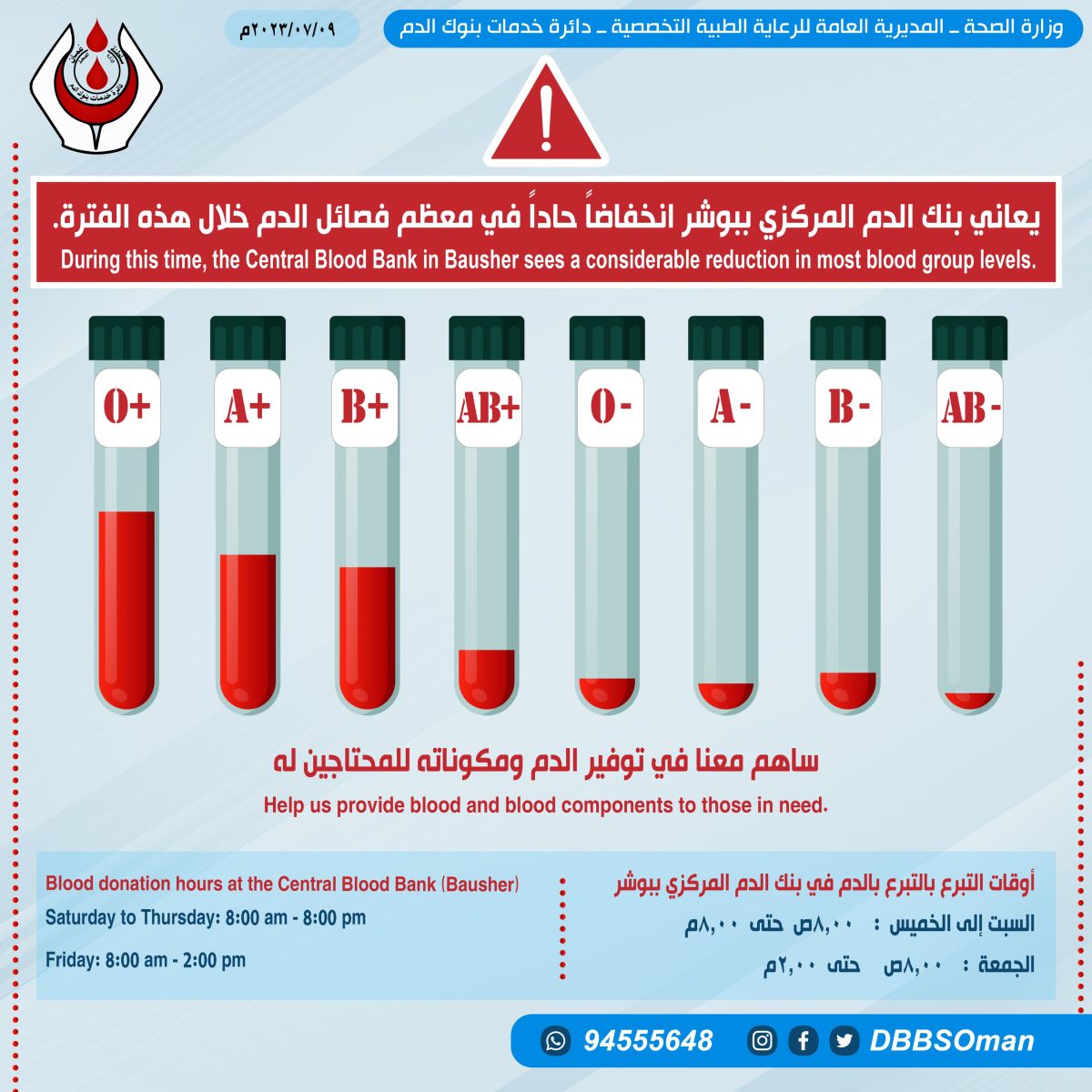 الوصال - جددت دائرة خدمات بنوم الدم بوزارة الصحة اليوم مناشدتها للمسارعة التبرع بالدم نظرٍا للحاجة الماسة للدم ومكوناته وانخفاض نسبة المتبرعين خلال الأسبوعين الماضيين بنسبة ٤٣٪، وذكرت الدائرة بأنه يمكن المتبرعين التوجه إلى بنك الدم المركزي ببوشر.