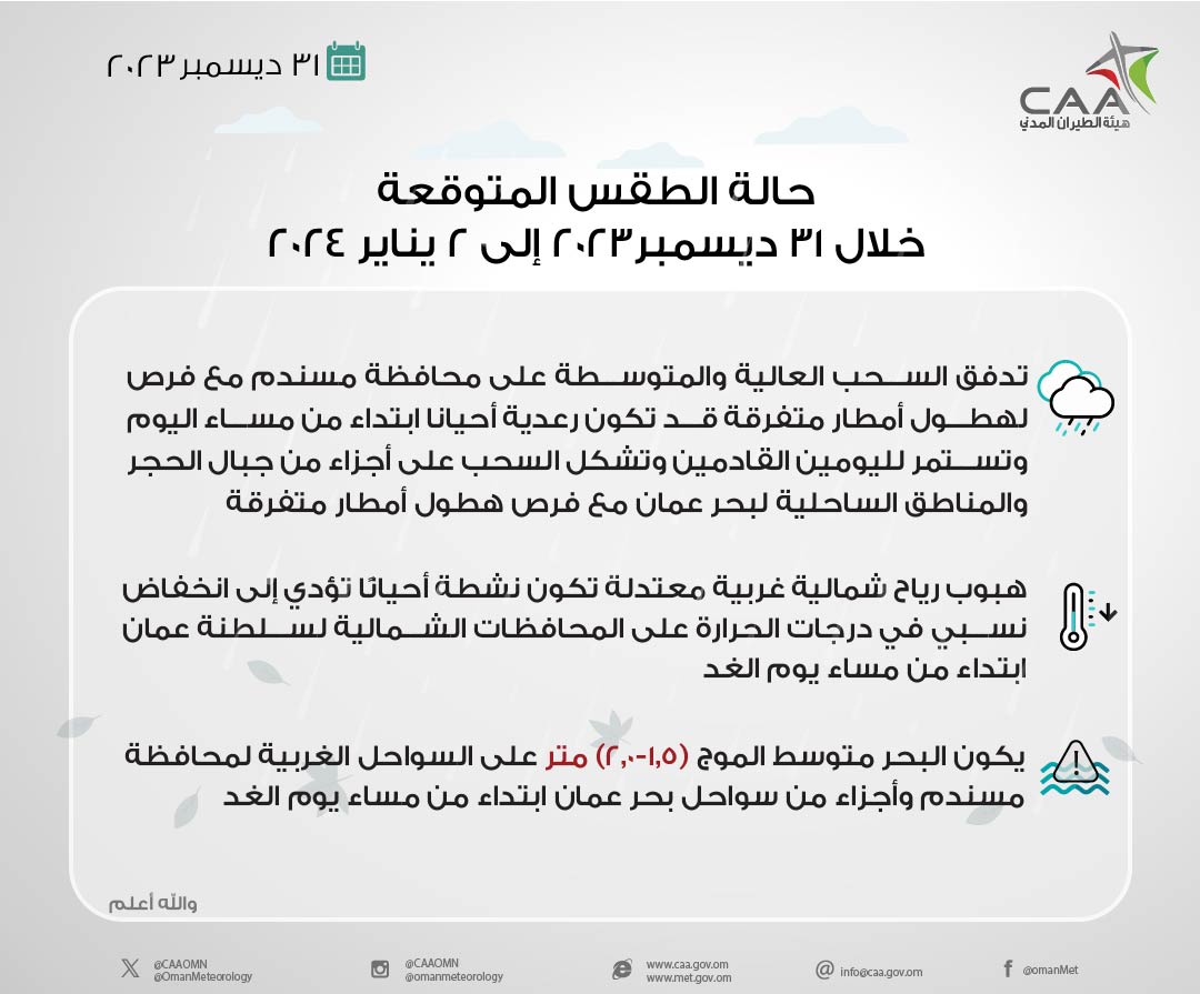 الوصال – أفادت الأرصاد العمانية عبر حسابها على "تويتر" باحتمال هطول أمطار متفرقة قد تكون رعدية أحيانا على محافظة مسندم ابتداء من مساء اليوم تستمر لليومين القادمين، وتشكل السحب على أجزاء من جبال الحجر والمناطق الساحلية لبحر عمان مع فرص هطول أمطار متفرقة.