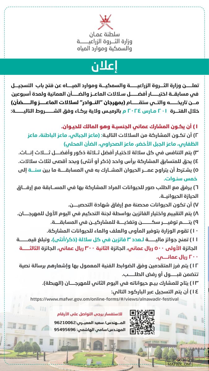 الوصال – أعلنت وزارة الثروة الزراعية والسمكية وموارد المياه عن فتح باب التسجيل في مسابقة اختيار أفضل سلالات الماعز والضأن العُمانية والتي ستقام بمهرجان " النوادر " لسلالات الماعز والضأن خلال الفترة 1-2 مارس 2024م بولاية بركاء.