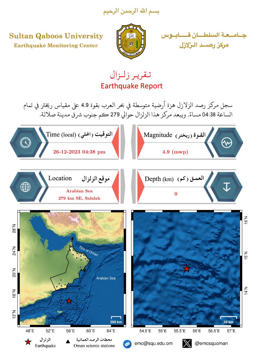 الوصال| سجل مركز رصد الزلازل بجامعة السلطان قابوس اليوم هزة أرضية متوسطة في بحر العرب بقوة 4.9 على مقياس ريختر في تمام الساعة 04:38 مساءً.