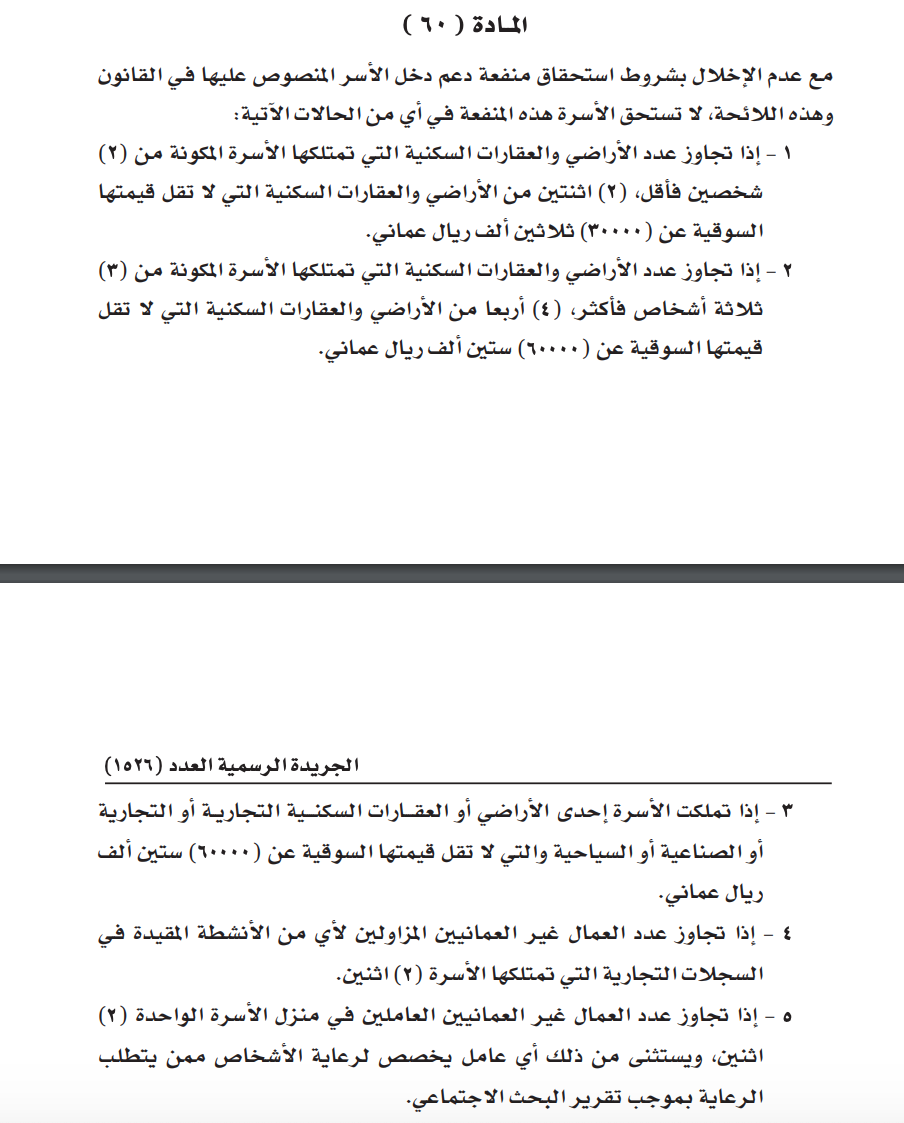 ٣ - إذا تملكت الأسرة إحدى الأراضي أو العقــــارات السكنــــية التجاريــة أو التجارية أو الصناعية أو السياحية والتي لا تقل قيمتها السوقية عن (60000) ستين ألف ريال عماني.