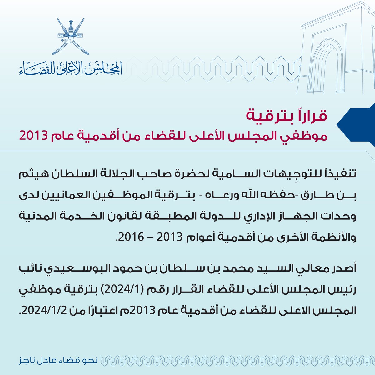 أصدر معالي السيد محمد بن سلطان بن حمود البوسعيدي نائب رئيس المجلس الأعلى للقضاء قرارًا بترقية موظفي المجلس الأعلى للقضاء من أقدمية عام 2013 اعتبارًا من 2024/1/2