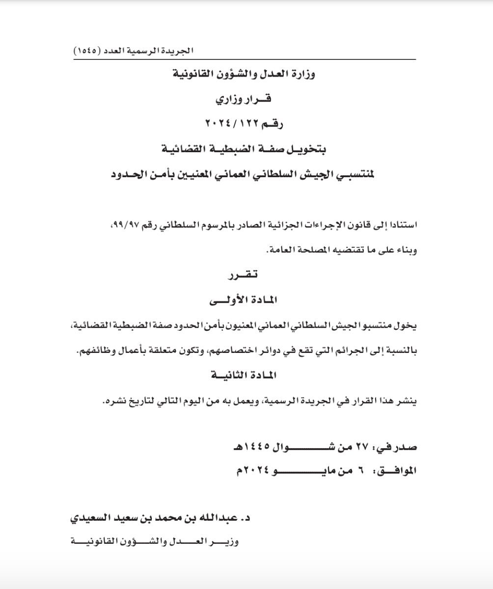 قرار وزاري بتخصيص صفة الضبطية القضائية لمنتسبي الجيش السلطاني العماني المعنيين بأمن الحدود