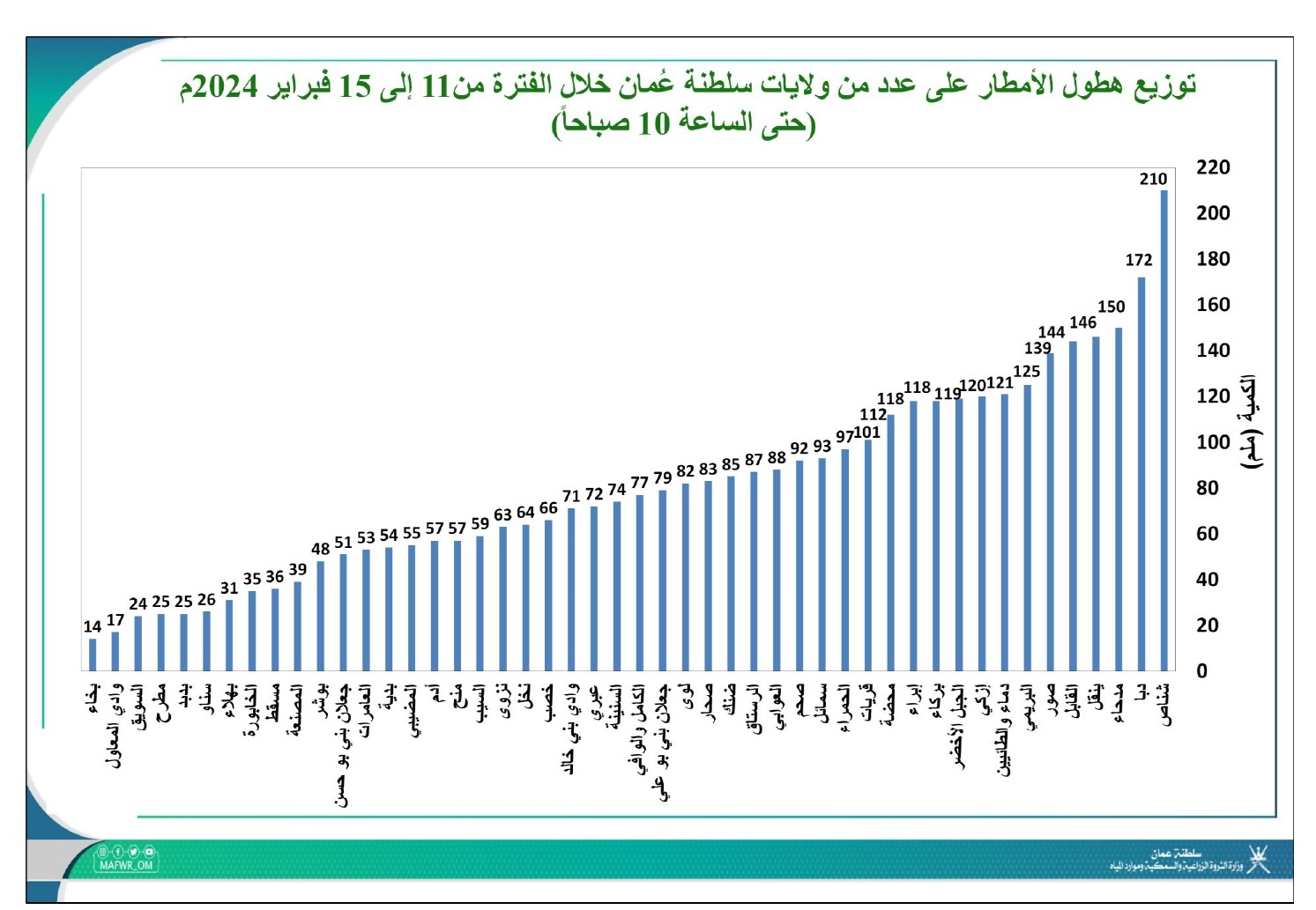 الوصال – سجلت ولاية شناص بشمال الباطنة أعلى معدل هطول أمطار بمقدار 210 ملم من الفترة خلال الفترة 11 إلى 15 فبراير 2024م ، وتلتها ولاية دبا بمحافظة مسندم ومن ثم مدحاء.