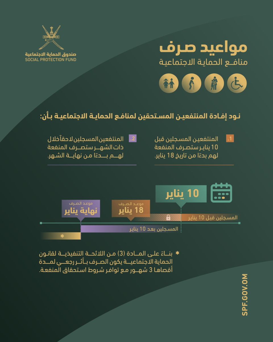 الوصال – ذكر صندوق الحماية الاجتماعية عبر حسابه على "تويتر" أنه سيتم صرف المنافع الاجتماعية للمستحقين المسجلين قبل 10 يناير بدءًا من تاريخ 18 يناير 2024م.