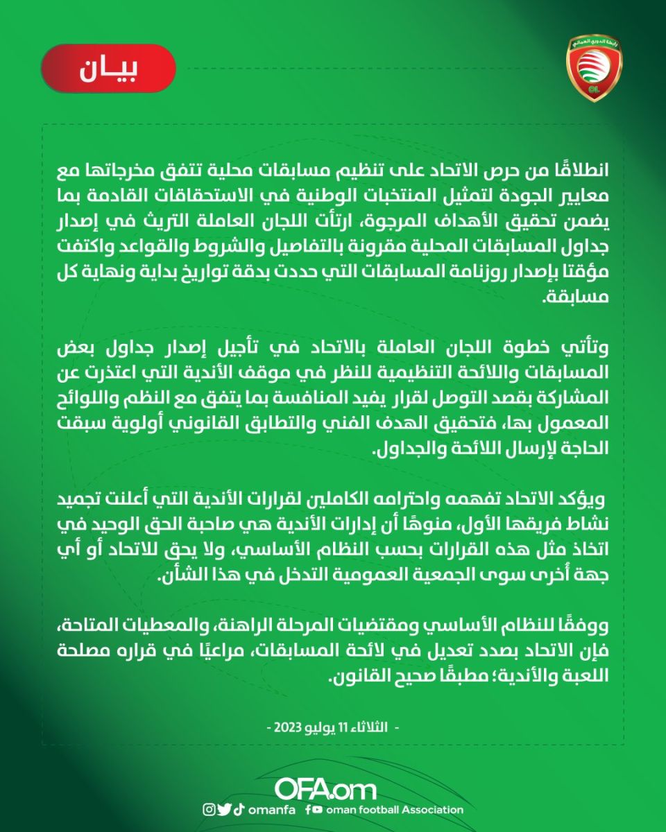 الوصال - أصدرت رابطة الدوري العماني اليوم بيانًا يفيد بتأجيل إصدار جداول بعض المسابقات واللائحة التنظيمية للنظر في موقف الأندية التي أعتذرت عن المشاركة بقصد التوصل لقرار يفيد المنافسة بما يتفق مع النظم واللوائح المعمول بها