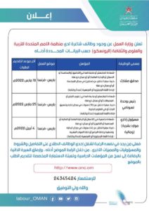 الوصال - أعلنت وزارة العمل عن وجود 3 وظائف شاغرة لدى منظمة الأمم المتحدة للتربية والعلوم والثقافة (اليونسكو) وهي :