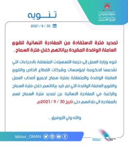 الوصال – مددت وزارة العمل فترة الاستفادة من المغادرة النهائية للقوى العاملة الوافدة المقيدة بياناتهم خلال فترة السماح والراغبة في المغادرة النهائية إلى بلدانهم حتى تاريخ 30\9\2021.