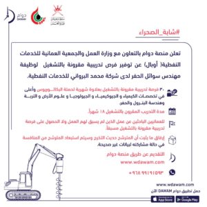 الوصال – أعلنت منصة دوام بالتعاون مع وزارة العمل والجمعية العمانية للخدمات النفطية أوبال عن توفير 30 فرصة تدريبية مقرونة بالتشغيل لوظيفة مهنــدس حفــر الســوائل لدى شركة محمد البرواني للخدمات النفطية