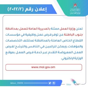 الوصال - أعلنت وزارة العمل ممثلة بالمديرية العامة للعمل بمحافظة جنوب الباطنة عن توفر فرص عمل وظيفية في مؤسسات القطاع الخاص العاملة بالمحافظة لمختلف التخصصات والمؤهلات، وعلى الراغبين في الالتحاق فرص العمل المعروضة التسجيل عبر الموقع الوزارة الإلكتروني للوزارة .