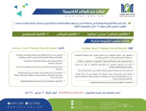 الصفحة الرئيسيةالأخبارالإعلان عن شواغر أكاديمية في الجامعة العربية المفتوحة الإعلان عن شواغر أكاديمية في الجامعة العربية المفتوحة 28 ديسمبر 2021 الوصال – أعلنت الجامعة العربية المفتوحة عن شواغر أكاديمية لديها في القانون الخاص (مدني\تجاري، والقانون الجزائي، والقانون الدستوري. وذلك حسب الشروط المرفقة التالية: