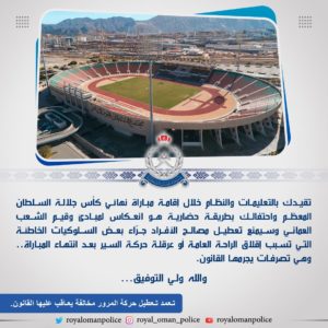 الوصال – أفادت الإدارة العامة للمرور بشرطة عمان السلطانية أن التقيّد بالتعليمات والنظام خلال إقامة مباراة نهائي كأس جلالة السلطان المعظم والاحتفال بطريقة حضارية هو انعكاس لمبادئ وقيم الشعب العماني وسيمنع تعطيل مصالح الأفراد جرّاء بعض السلوكيات التي تسبب إقلاق الراحة العامة أو عرقلة حركة السير بعد انتهاء المباراة، وهي تصرفات يجرمها القانون.