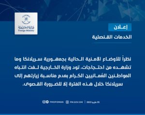 الصفحة الرئيسيةالأخبارالخارجية تنبه بعدم زيارة سيرلانكا في الفترة الحالية الخارجية تنبه بعدم زيارة سيرلانكا في الفترة الحالية 25 مايو 2022 الوصال - نبهت وزارة الخارجية بأنه غير مناسب زيارة سريلانكا خلال هذه الفترة إلا للضرورة القصوى نظرًا لما تشهده سريلانكا من احتجاجات وأوضاع أمنية غير مستقرة.