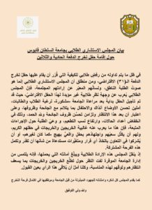 وأضاف البيان : إن المجلس ينقل هذه الإرادة الطلابية ويبلغ أمانته التي يحملها، ويلتمس من إدارة الجامعة الموقرة لفت النظر حول تطلع الخريجين والخريجات بما يسعف انتظارهم وتوقهم لهذه المناسبة، وكلنا أمل أن يلاقى هذا الرأي بعين القبول مضيفاً بأن المجلس يقدم كل شكره وامتنانه للجهود المبذولة من قبل الجامعة وموظفيها في اكتمال فرحة التخرج
