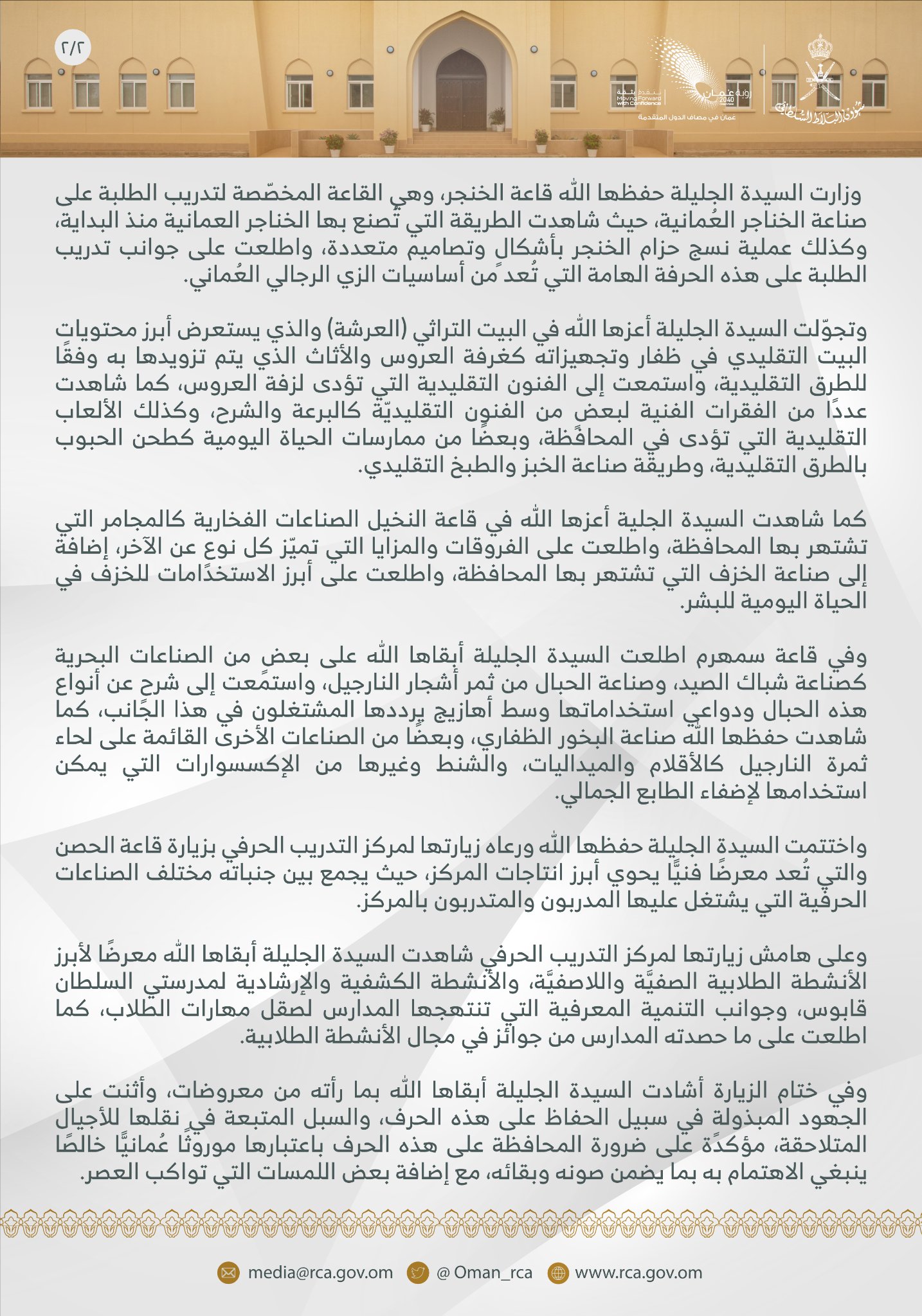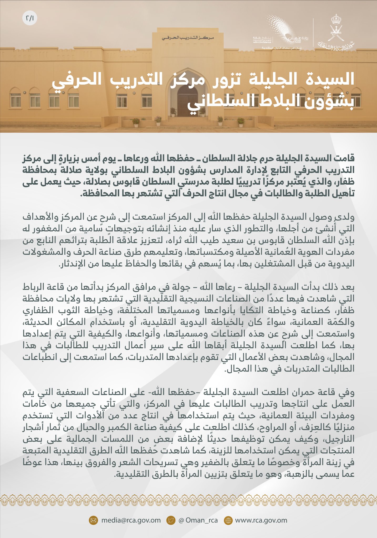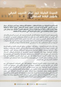 الصفحة الرئيسيةالأخبارالسيدة الجليلة تزور مركز التدريب الحرفي بشؤون البلاط السلطاني في صلالة السيدة الجليلة تزور مركز التدريب الحرفي بشؤون البلاط السلطاني في صلالة 30 أغسطس 2021 الوصال - زارت السيدة الجليلة حرم جلالة السلطان -حفظها الله ورعاها- مركز التدريب الحرفي بشؤون البلاط السلطاني بولاية صلالة. وتجولت في مرافق المركز، واطلعت على أبرز ما يحويه من صناعات تقليدية، والجهود المبذولة للحفاظ عليها وتطويرها .
