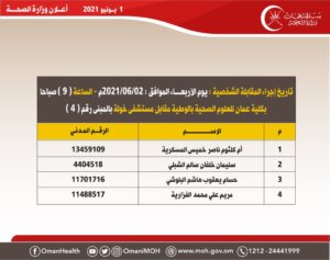 الوصال – أعلنت زارة الصحة بالتنسيق مع وزارة العمل للمواطنين المبينة أسماؤهم فيما بعد والذين سبق لهم ان تقدموا بطلباتهم لشغل الوظيفة الشاغرة بكلية عمان للعلوم الصحية – فرع جنوب الشرقية ، بأن عليهم الحضور لإجراء الاختبار التحريري في المكان والزمان الموضحين بالإعلان.