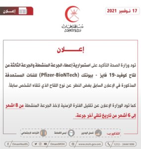 وأكدت الوزارة استمرارها في إعطاء الجرع المنشطة والجرعة الثالثة من لقاح فايزر – بيونتك للفئات المستهدفة بغض النظر عن نوع اللقاح الذي تلقاه الشخص سابقًا.