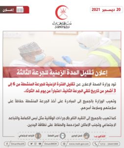 وتهيب الوزارة بالجميع إلى المبادرة بأخذ الجرعة المنشطة حفاظًا على سلامتهم وسلامة أسرهم، والتقيد التام بالإجراءات الوقائية مثل لبس الكمامة والتباعد الاجتماعي وتجنب الأماكن المزدحمة والحفاظ على نظافة اليدين.