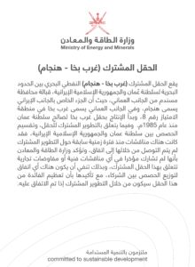 الوصال – نفت وزارة الطاقة والمعادن حول ما تم تداوله عن اتفاق لتوزيع حصص حقل النفط البحري الحدودي (غرب بخا - هنجام) المشترك بين سلطنة عمان والجمهورية الإسلامية الإيرانية.