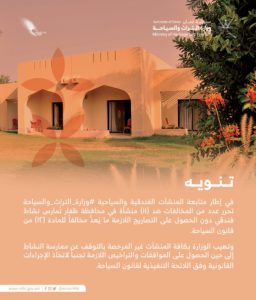 وأهابت الوزارة عبر حسابها على "تويتر" كافة المنشآت غير المرخصة بالتوقف عن ممارسة النشاط إلى حين الحصول على الموافقات والتراخيص اللازمة تجنبا لاتخاذ الإجراءات القانونية وفق اللائحة التنفيذية لقانون السياحة.