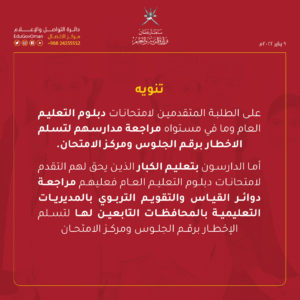 وأضافت الوزارة عبر حسابها على "تويتر" أن الدارسين بتعليم الكبار الذين يحق لهم التقدم لامتحانات دبلوم التعليم العام عليهم مراجعة دوائر القياس والتقويم التربوي بالمديريات التعليمية بالمحافظات التابعين لها لتسلم الإخطار برقم الجلوس ومركز الامتحان.