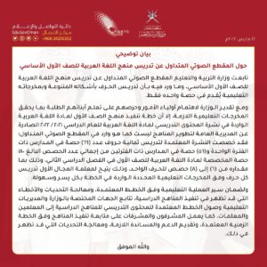 التربية تصدر بيانًا حول المقطع الصوتي المتداول وتؤكد أن عدد الحصص لتدريس الحرف الواحد تتراوح من 6 إلى 8 حصص
