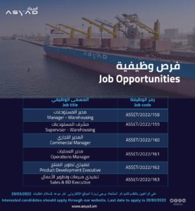 الوصال – أعلنت مجموعة أسياد عن مجموعة من الفرص الوظيفية في مختلف التخصصات للانضمام وللراغبين في التقدم لهذه الفرص عبر الرابط التالي: