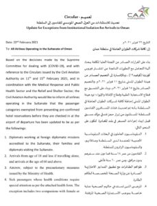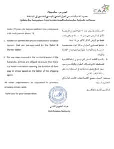 الصفحة الرئيسيةالأخباراستثناء 6 فئات من العزل الصحي الموسسي استثناء 6 فئات من العزل الصحي الموسسي 23 فبراير 2021 الوصال - أصدرت هيئة الطيران المدني تعميمًا لاستثناء 6 فئات من المسافرين القادمين إلى السلطنة من العزل الصحي المؤسسي بحسب الموضحة في البيان المرفق: