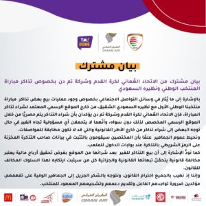 بيان مشترك من الاتحاد العُماني لكرة القدم وشركة تم دن بخصوص تذاكر مباراة المنتخب الوطني ونظيره السعودي.