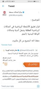 ضبابية حول إغلاق صالات اللياقة البدنية بعد حذف مركز اتصالات بلدية مسقط تغريدة توضيحية