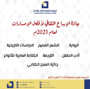 في دورتها الثانية عشر.. الجمعية العُمانية للكتاب والأدباء تعلن عن جائزة الإبداع الثقافي لأفضل الإصدارات الأدبية لعام 2021م
