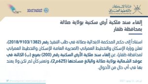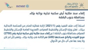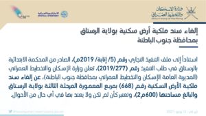 الصفحة الرئيسيةالأخبارإلغاء 3 سندات ملكيات أراضي سكنية وتجارية إلغاء 3 سندات ملكيات أراضي سكنية وتجارية 03 يونيو 2021 الوصال – أعلنت وزارة الإسكان والتخطيط العمراني عن إلغاء 3 سندات ملكيات أراضي سكنية وتجارية وذلك بموجب أحكام قضائية. حيث ألغي سند ملكية أرض سكنية تجارية في ولاية بركاء وأرض سكنية في ولاية الرستاق وأرض سكنية في ولاية صلالة.